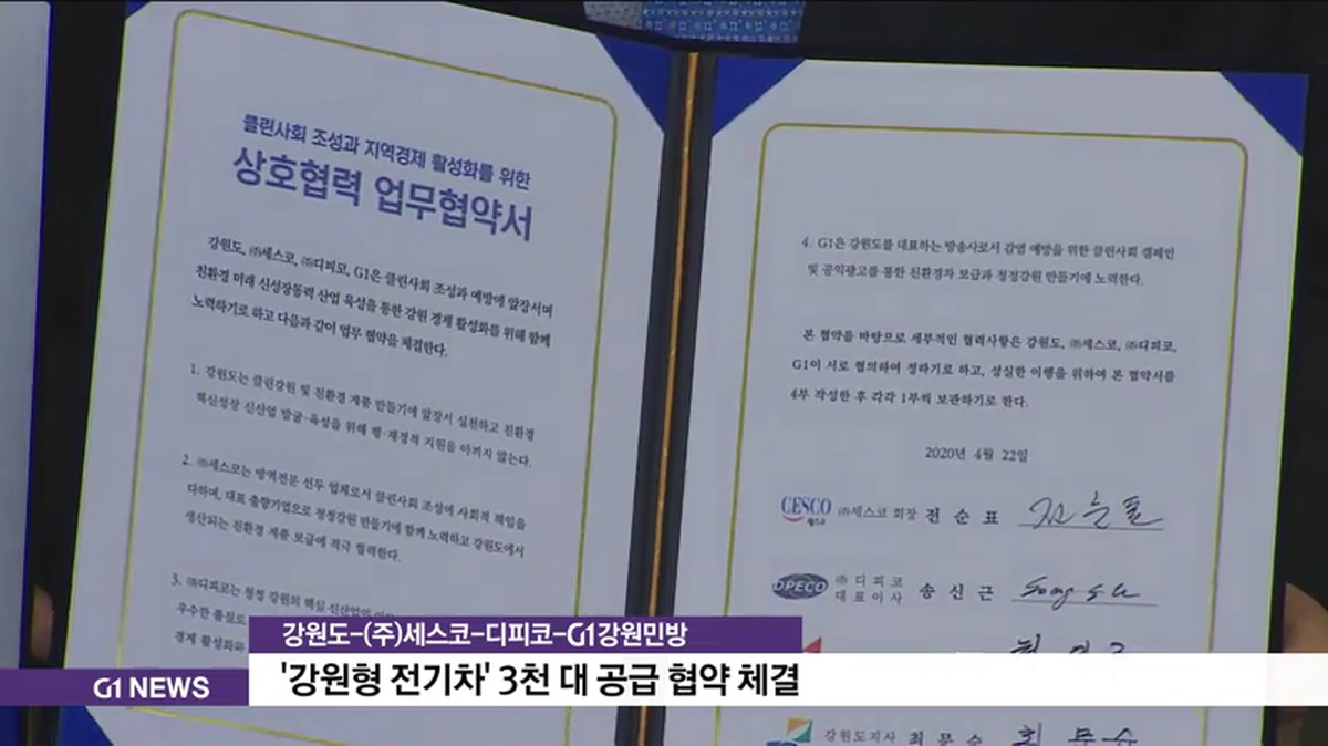 강원도와 강원형 전기차 생산 업체 디피코, 글로벌 위생 기업 세스코, G1강원민방은 '클린 사회 조성과 지역 경제활성화를 위한 업무 협약을 체결했습니다.