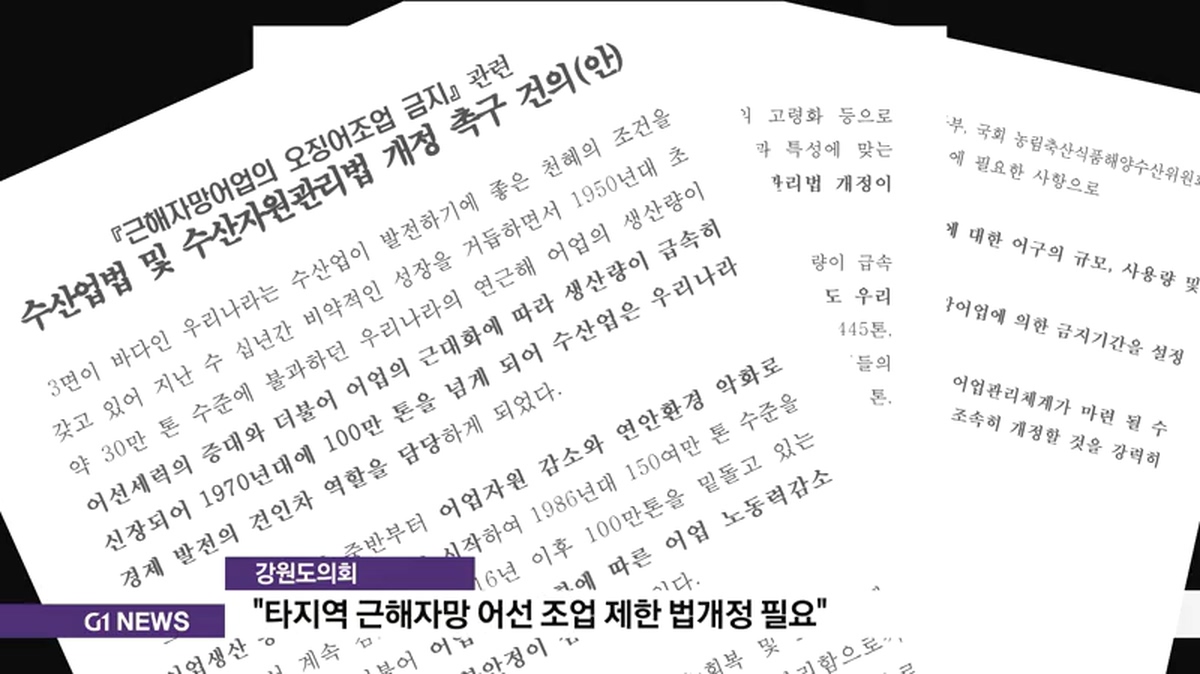 또 지역과 해역별 특성을 고려해 어구의 규모와 사용량, 금지 구역과 기간을 제한할 수 있도록 관련법을 조속히 개정하라고 촉구했습니다.