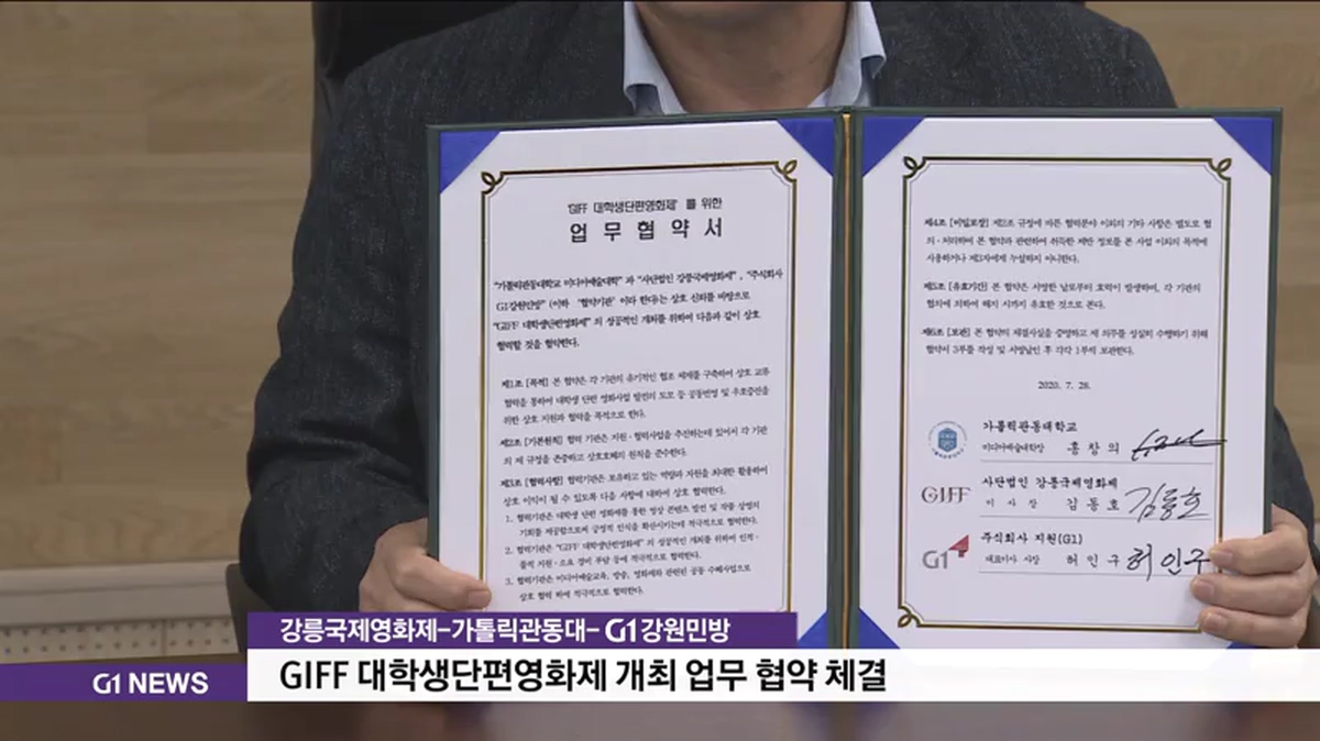 오늘 협약식엔 GIFF 강릉국제영화제 김동호 이사장과 가톨릭관동대학교 홍창의 미디어예술학과장, G1강원민방 허인구 사장 등 주요 관계자가 참석해 GIFF 대학생단편영화제의 성공적인 개최와 발전을 위해 협력하기로 했습니다.