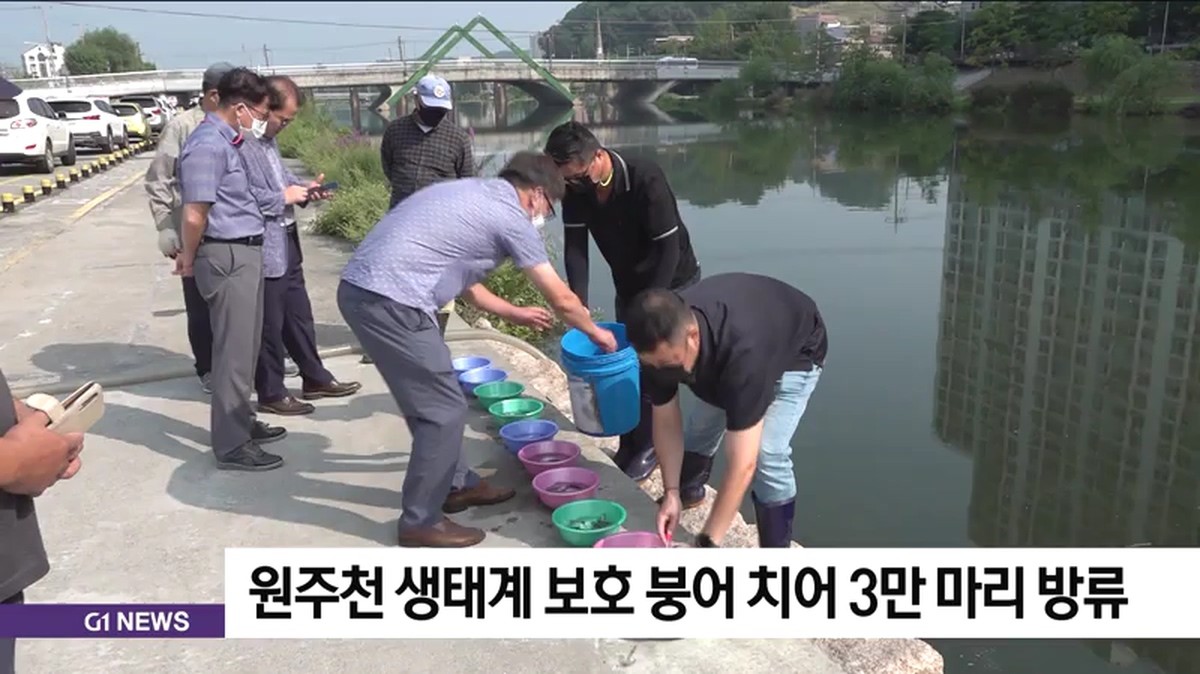 원주시가 원주천의 생태계를 보호하고 어족자원을 늘리기 위해 붕어 치어 3만 마리를 방류했습니다.