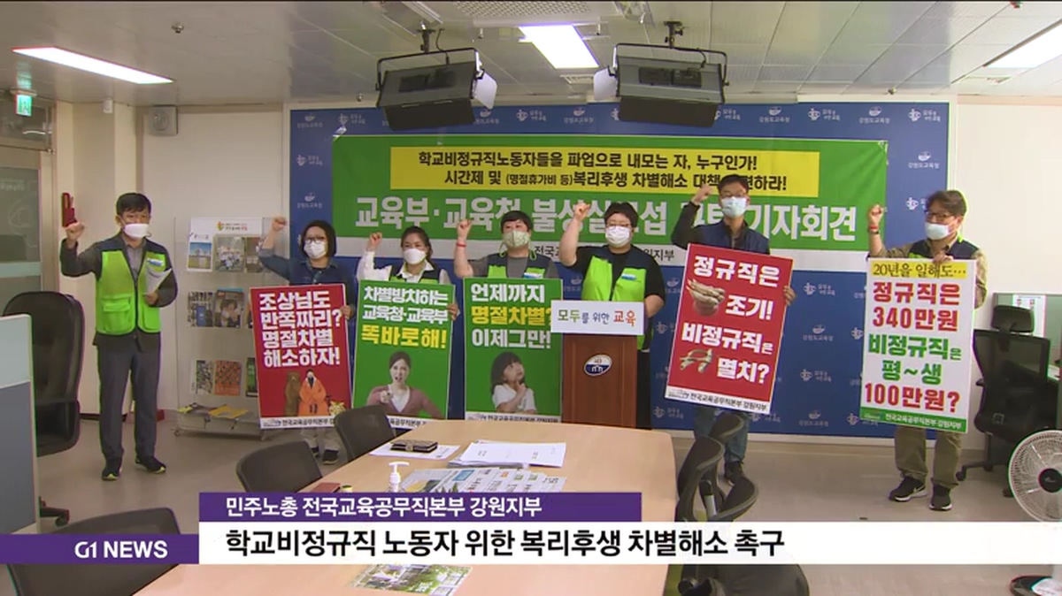 민주노총 전국교육공무직본부 강원지부는 기자회견을 열고, 시간제 교사 등 학교 내 비정규직 노동자는 복리후생비가 정규직의 절반 수준도 안된다며 차별이라고 주장했습니다.