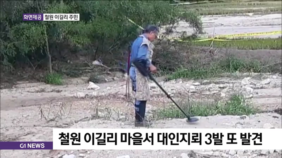 군 당국과 주민들에 따르면 어제(23일) 철원군 이길리 마을의 한 개울가에서 폭우로 유실된 것으로 추정되는 M14 대인지뢰 3발이 민간인에 의해 추가로 발견됐습니다.