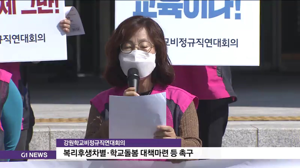 강원학교비정규직연대회의는 도교육청 앞에서 기자회견을 열고, "코로나19 이후 제대로 된 안전지침 없이 돌봄교실을 운영해왔지만 처우는 정규직의 절반 수준에도 미치지 못하는 차별을 겪고 있다"고 주장했습니다.