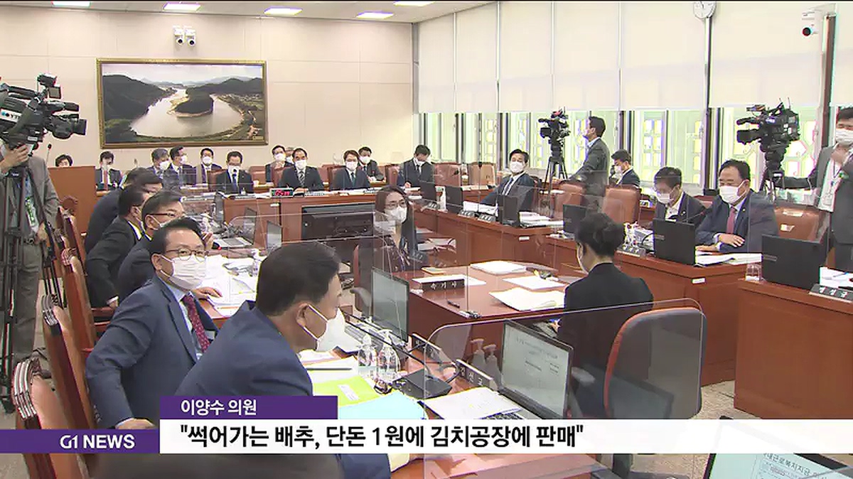 이 의원은 "보관한계일보다 최대 98일이 지난 썩은 배추 160톤을 kg당 1원에 김치공장에 넘긴 사례도 있다"며, "김치공장은 하품의 배추로 가공한 김치임을 표시하도록 하는 제도적 장치가 시급하다"고 밝혔습니다.