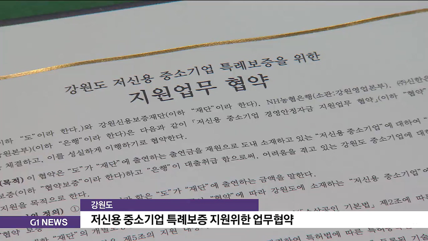 강원도는 도내 저신용 중소기업에 대한 자금지원 기회를 마련하기위해 강원신용보증재단과 NH농협은행, 신한은행과 업무협약을 맺었습니다.