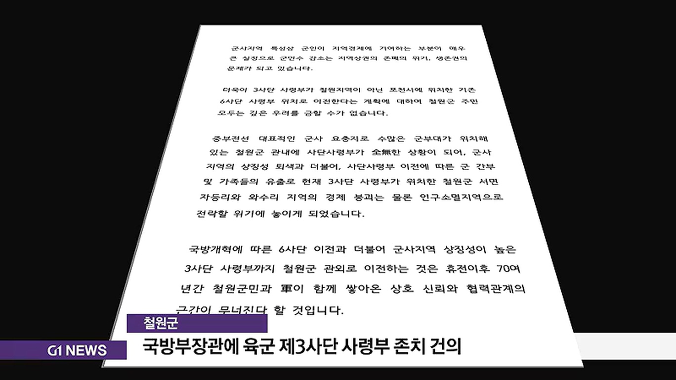 이들은 건의문에서 "군사지역 상징성이 높은 육군 제3사단 사령부까지 관외 지역으로 이전하면, 지난 70여년간 철원군민이 군과 함께 쌓아온 상호 신뢰와 협력 관계의 근간이 무너지게 될 것"이라고 우려했습니다.
