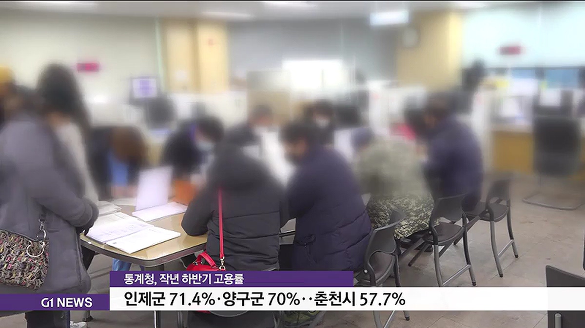 작년 하반기 고용률은 인제군 71.4%, 양구군 70% 순서로 높았고, 춘천시는 57.7%를 기록해 가장 낮았습니다.