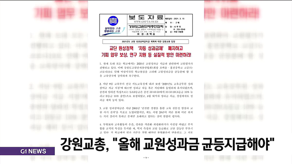 강원도교원단체총연합회가 올해 교원 성과급을 균등 지급해야한다고 촉구했습니다.