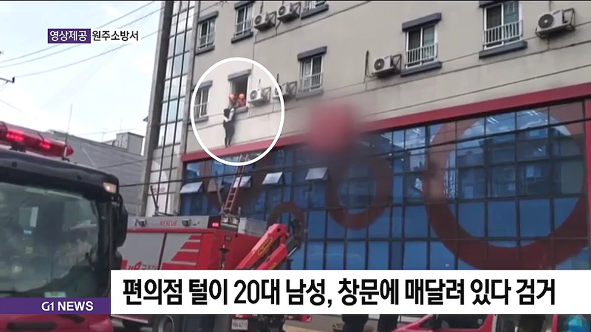 오늘 원주에서 건조물 침입과 절도 혐의를 받고 있는 20대 남성 최모 씨가 도주 중 모텔 건물 3층 난간에 매달려 있다가 소방과 경찰의 공조로 검거됐습니다.