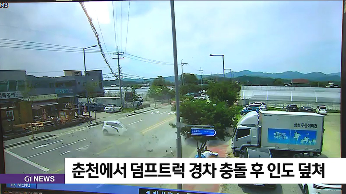 춘천에서 덤프트럭 경차 충돌 후 인도 덮쳐