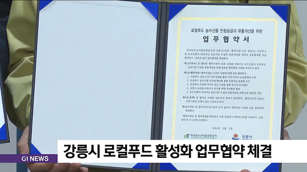 강릉시는 한국농수산식품유통공사와 로컬푸드 농수산물의 안정적인 공급기반을 조성하고, 유통구조를 개선하기 위해 업무협약을 체결했습니다.
