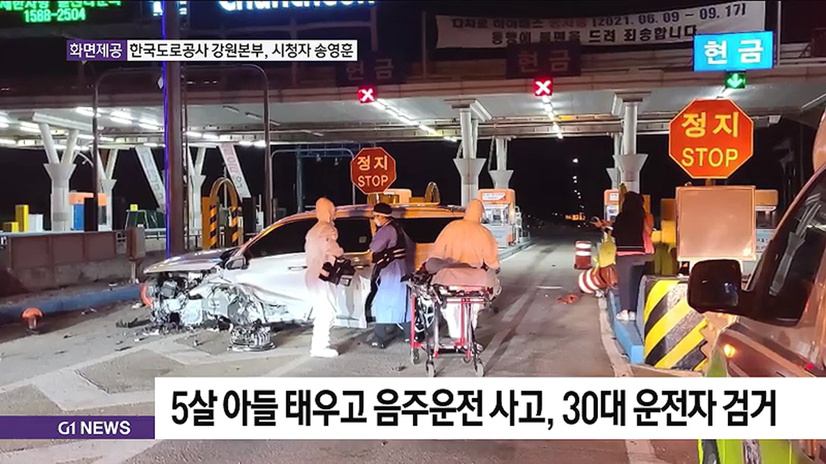 5살 된 아들을 차에 태우고 음주 운전을 하다 고속도로 요금소 분리대를 들이받은 30대 운전자가 경찰에 붙잡혔습니다.