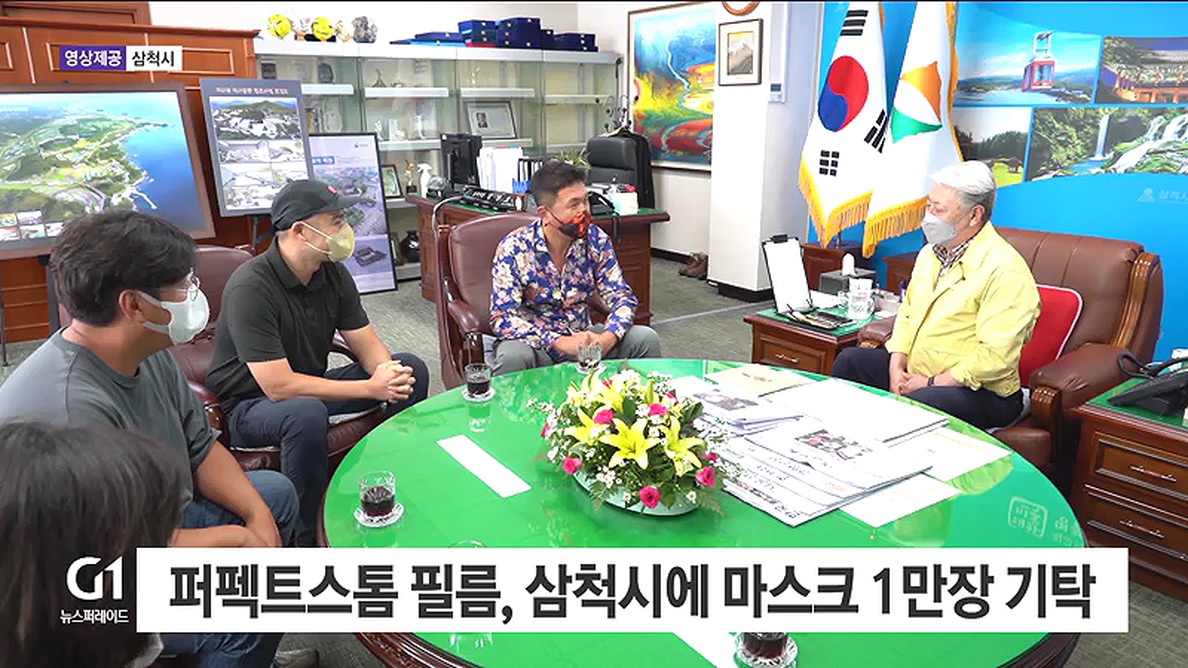 영화제작사 퍼펙트스톰 필름이 영화촬영 장소로 주목받고 있는 삼척시에 마스크 만장을 전달했습니다.