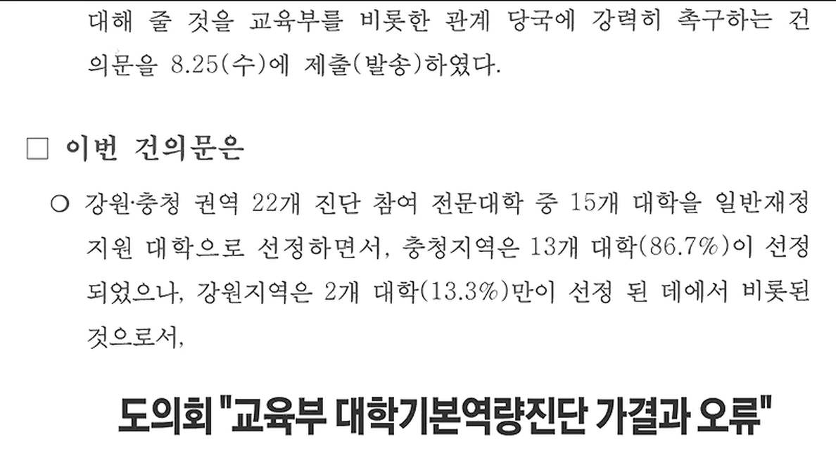 강원도의회는 최근 교육부가 발표한 대학 기본역량 진단 가결과에 대해 오류가 있다며 강력히 항의했습니다.