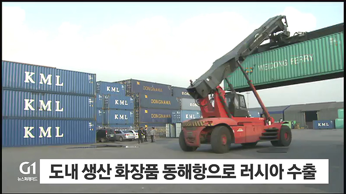 도내에서 생산된 화장품이 동해항을 통해 첫 러시아 수출길에 올랐습니다.