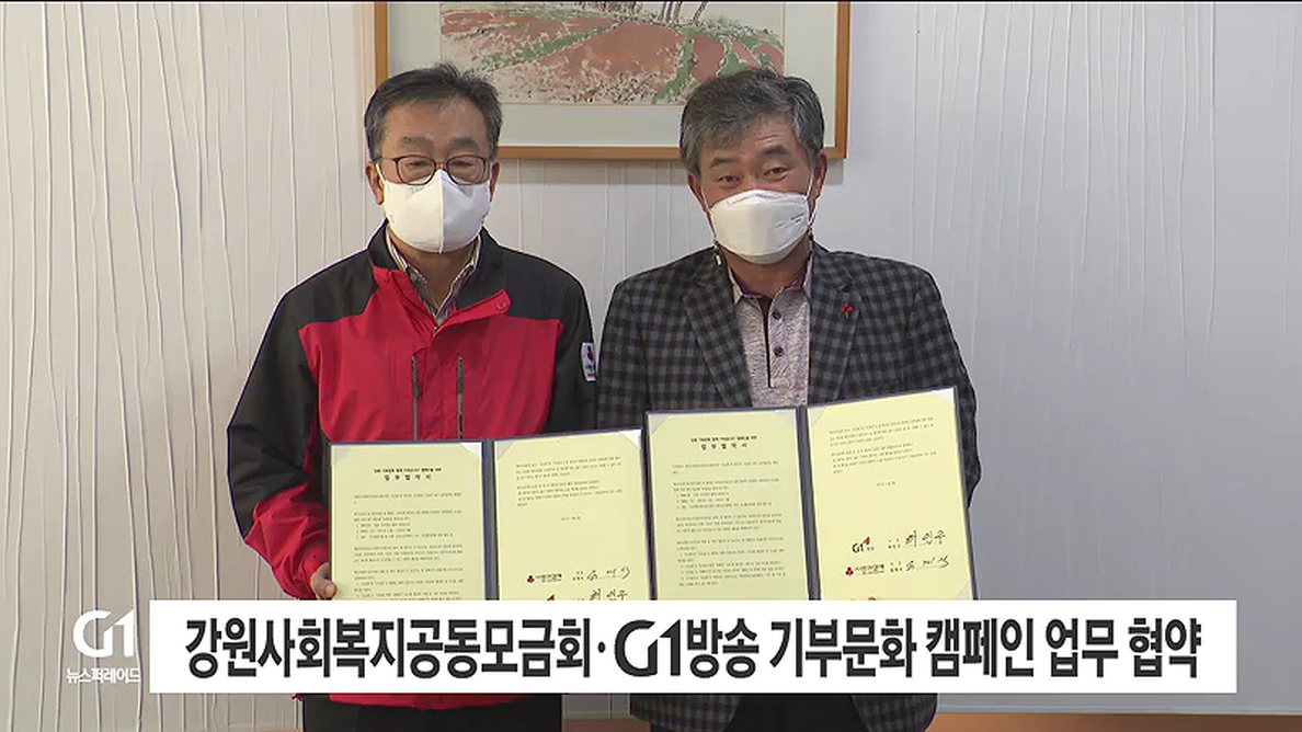 강원사회복지공동모금회와 G1방송이 코로나19 장기화로 고통받고 있는 도내 소외계층을 돕기위한 업무 협약을 맺었습니다.
