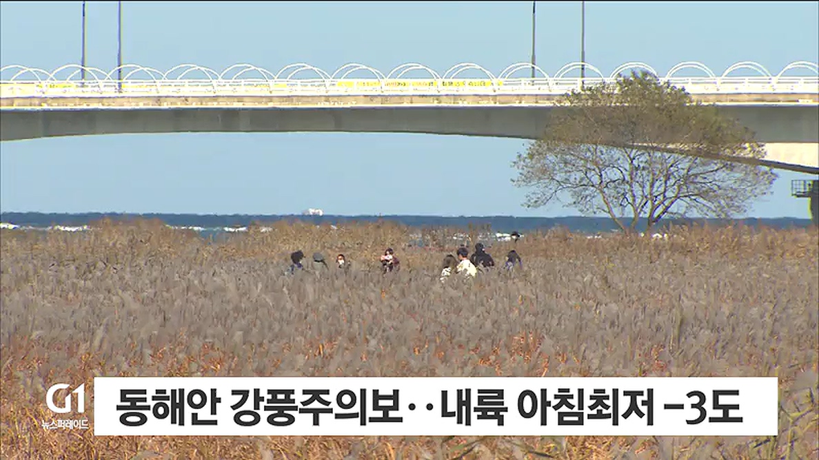 강원 영동권에 강풍주의보가 내려진 가운데, 내일 오전까지 강한 바람이 불겠고 아침기온은 영하권으로 떨어지겠습니다.