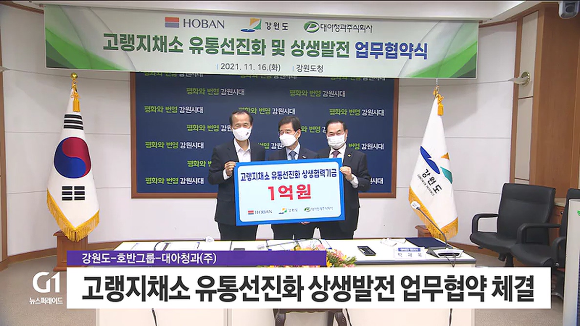 강원도와 호반그룹, 대아청과 주식회사는 도청에서 '고랭지 채소 유통선진화와 상생 발전을 위한 업무 협약'을 체결했습니다.