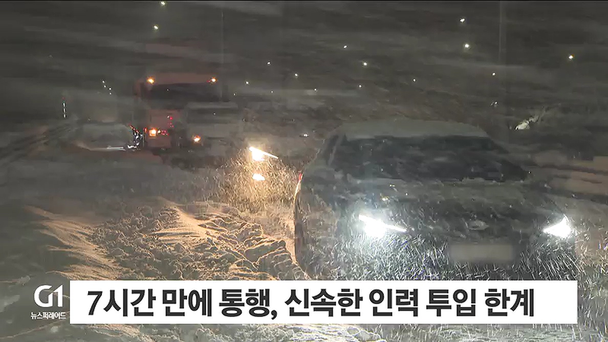폭설이 내린 뒤 7시간이 지나서야 겨우 1차로를 확보해 통행이 가능했습니다.