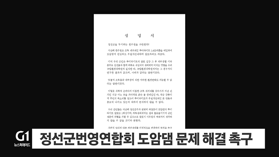 정선군번영연합회가 도암댐 문제 해결을 촉구하는 성명을 채택하고, 한국수력원자력의 루미라이트 살포 계획을 규탄하고 나섰습니다.