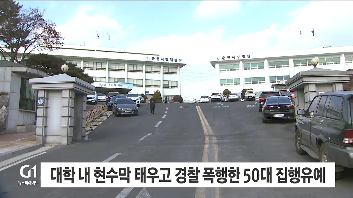 A씨는 지난 9월, 춘천의 한 대학교 안에 설치된 현수막을 두 차례 불 태우고, 주취 소란을 피운다는 112 신고를 받고 출동한 경찰관을 폭행한 혐의 등으로 기소됐습니다.