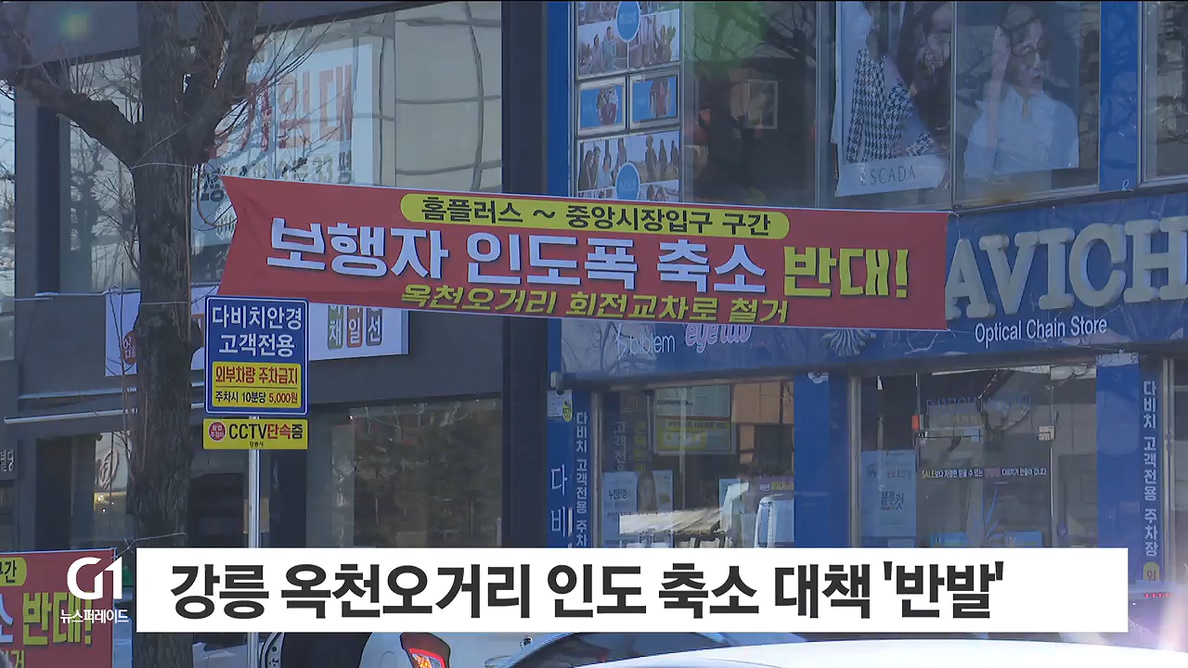 옥천오거리 일대 상인들은 "회전교차로를 원상복구하면 간단히 해결될 문제를 강릉시는 홈플러스에서 중앙시장 입구 구간의 인도 폭을 현재 3.3m에서 1.5m로 축소하려 한다"며,
