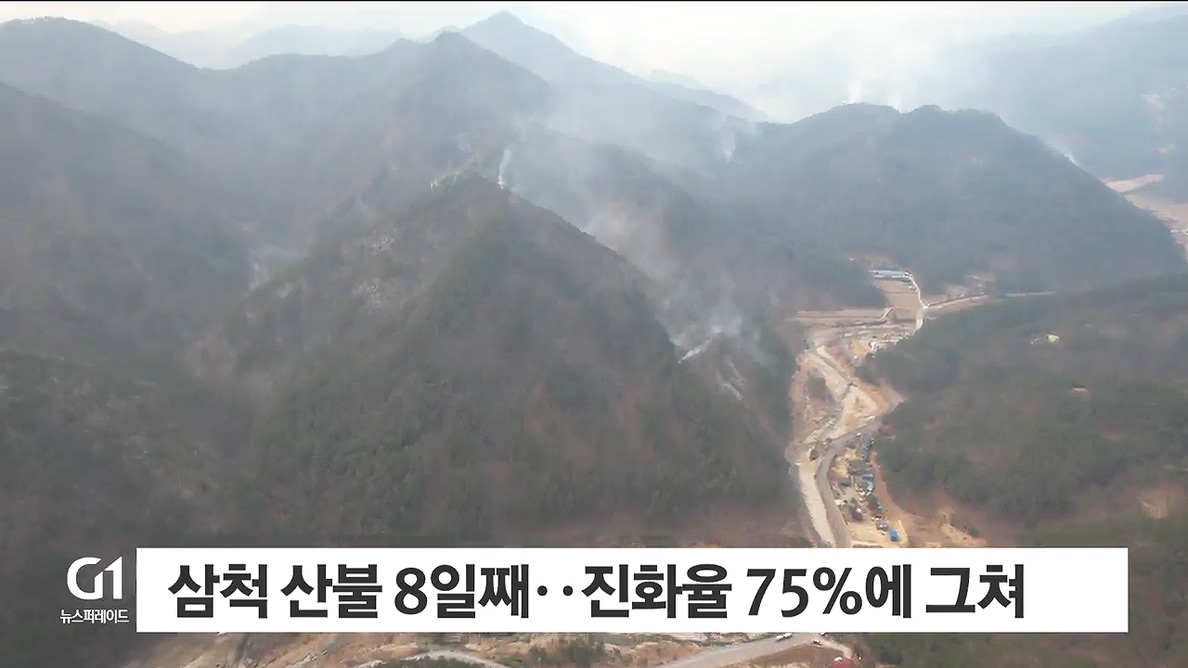 강원도 동해안산불방지센터는 지난 5일 경북 울진에서 시작해 삼척까지 확산한 산불이 현재 진화율 75%에 머물고 있다고 밝혔습니다.