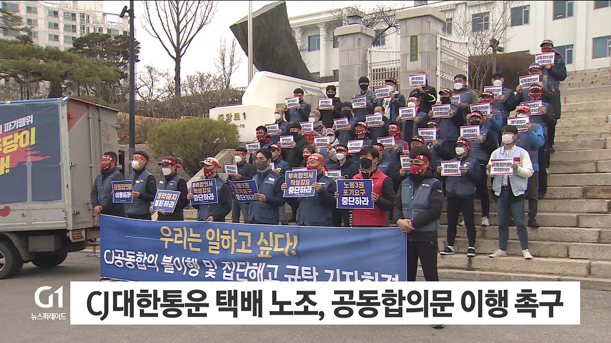 CJ대한통운 택배 노조 강원지부는 오늘(14일) 강원도청 앞에서 기자회견을 열고 공동합의문 이행을 촉구했습니다.