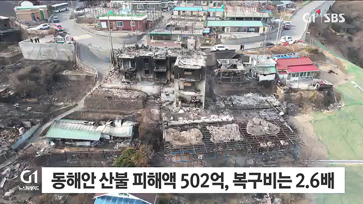 강원도 동해안 산불 피해액이 502억 원이며, 복구비는 피해액의 2.6배에 달하는 1,301억 원이 필요한 것으로 조사됐습니다.