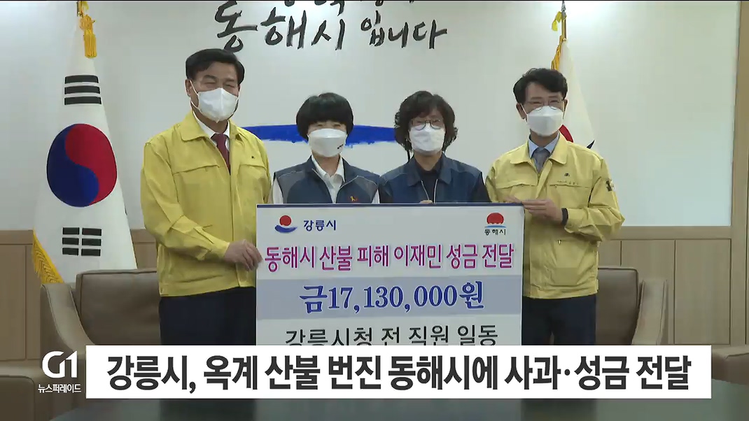 강릉시가 옥계면에서 발생한 산불이 동해시로 번져 피해를 입힌데 대해, 동해시에 사과하고 피해 복구 성금을 전달했습니다.