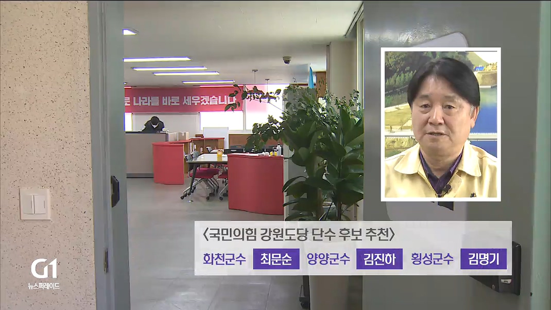 국민의힘 강원도당은 제5차 공관위 회의를 열고 화천군수 최문순, 양양군수 김진하, 횡성군수에 김명기 후보를 단수 후보 추천했습니다.