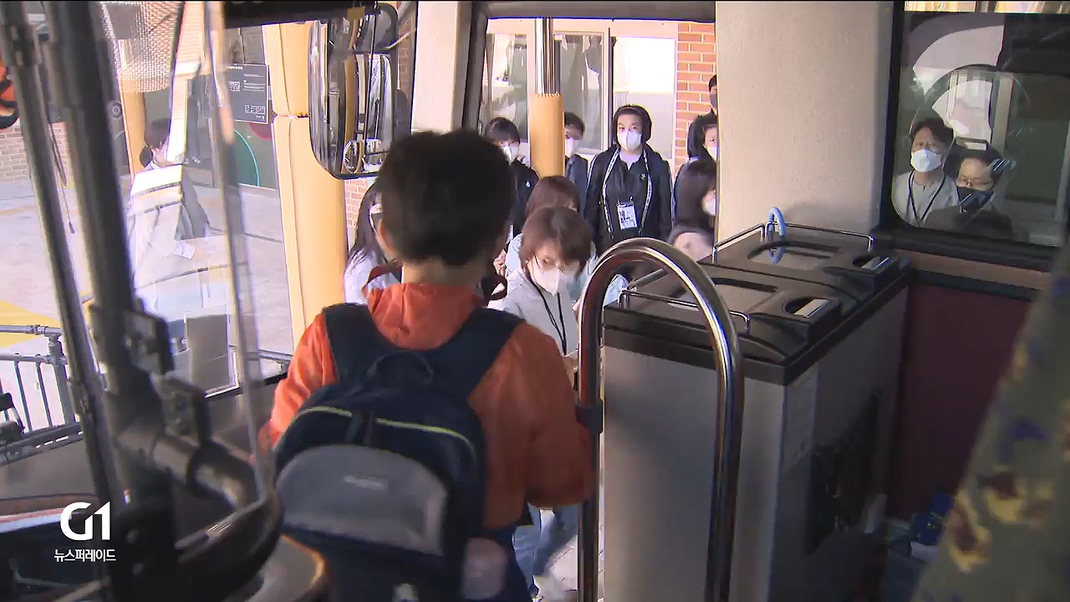 등교시간이 되자, 버스에서 삼삼오오 학생들이 내립니다.