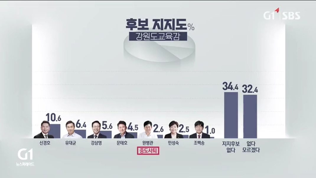 신경호 후보가 10.6%로 가장 높았고, 이어 유대균 후보 6.4%, 강삼영 후보 5.6%, 문태호 후보 4.5%, 민성숙 후보 2.5%, 조백송 후보 1% 등의 순이였습니다.