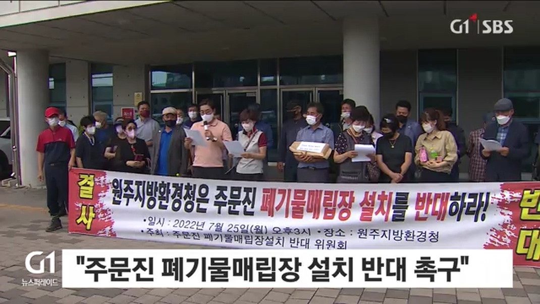 주문진 폐기물매립장 설치 반대 위원회가 원주지방환경청에서 기자회견을 열고, 환경청에 매립장 설치를 적극 반대하라고 요구했습니다.