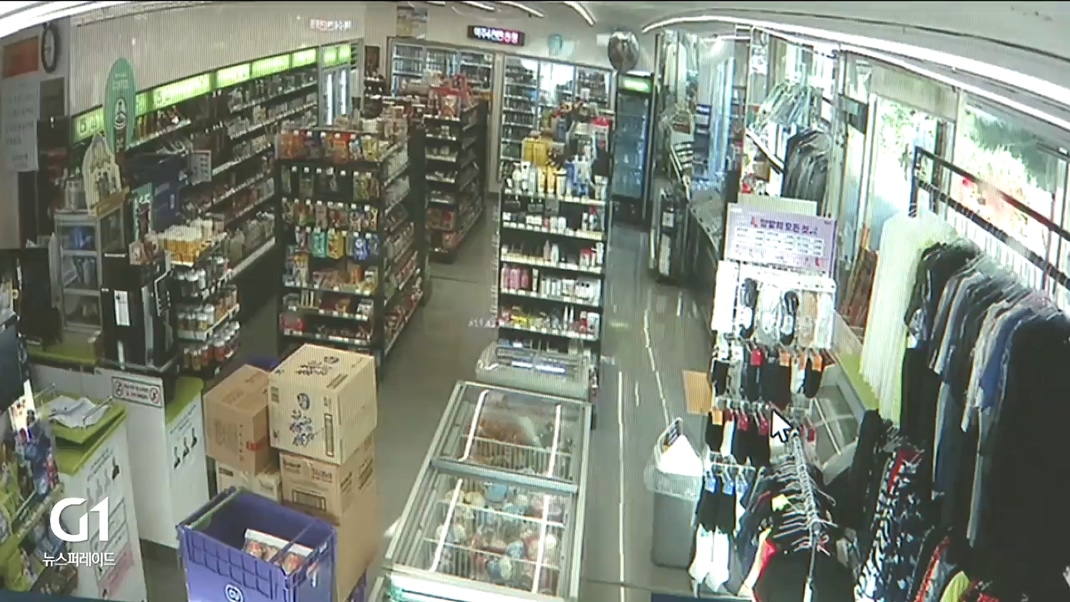 편의점 진열 상품이 잠시 흔들리는가 싶더니, 갑자기 건물이 무너져 내립니다.