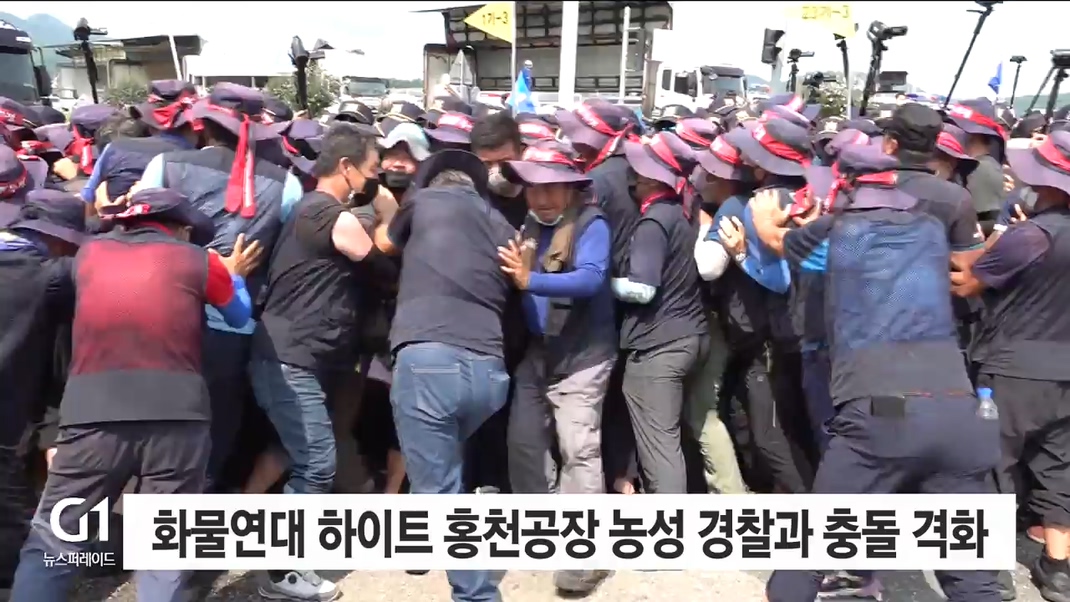 홍천공장은 어제 경찰이 투입돼 공장을 오가는 진입로를 확보했지만, 오늘 오전 민주노총 화물연대가 다시 막아서면서 한때 상품 출하가 중지됐습니다.