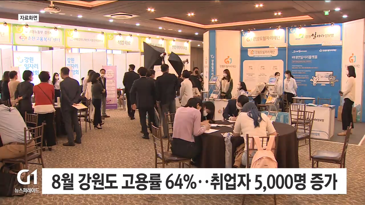 강원지방통계지청이 발표한 '2022년 8월 강원도 고용 동향'을 보면, 지난달(8월) 강원도 고용률은 64%로 지난해 같은 기간과 비교해 0.2% 포인트 상승했습니다.