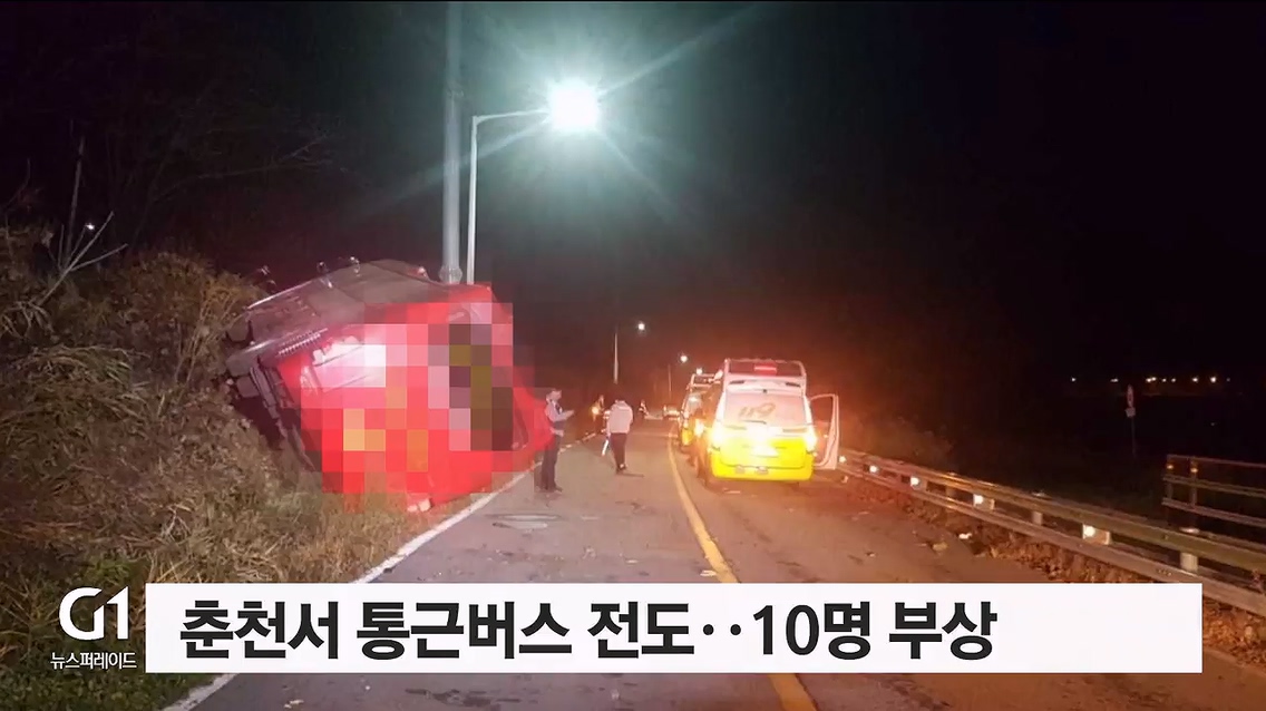 오늘 오전 5시 57분쯤 춘천시 남산면 강촌리 인근에서 45인승 통근 버스가 주행 중 넘어졌습니다.