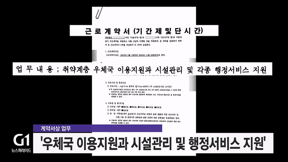 계약서상 A 씨의 역할은 '취약계층 우체국 이용 지원과 시설관리 및 행정서비스 지원'이라고 명시돼 있습니다.