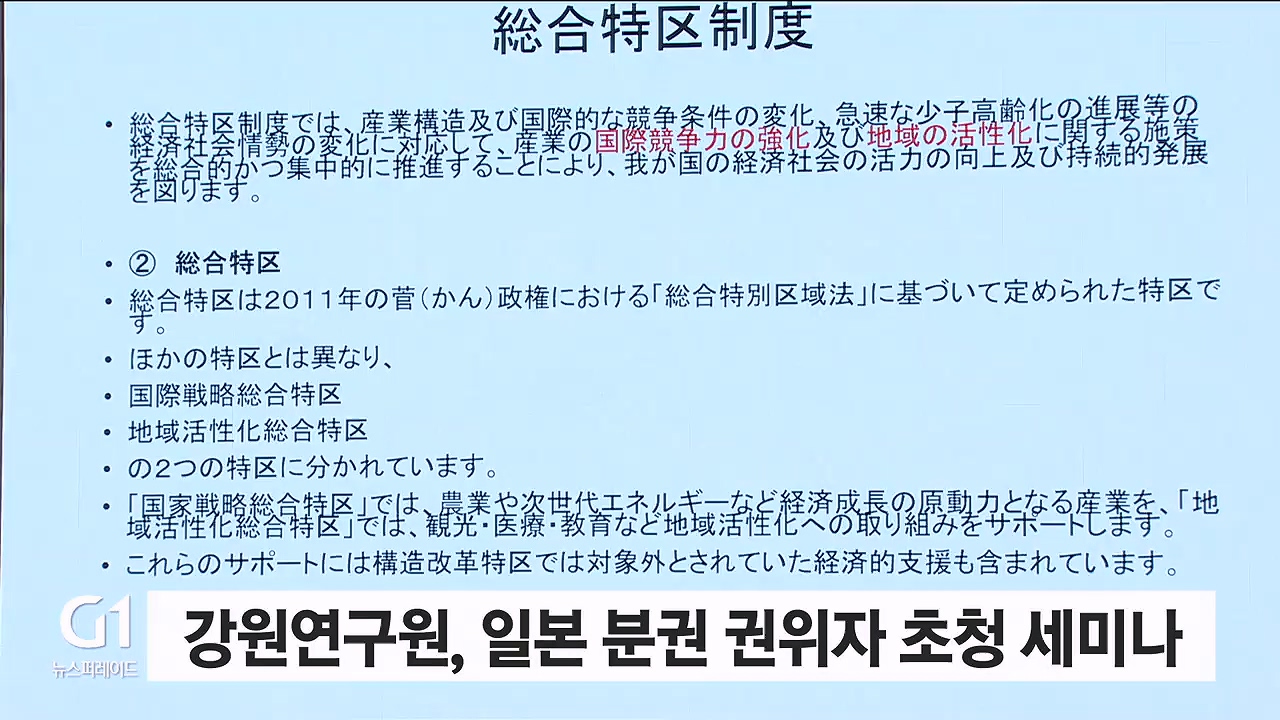 이번 세미나는 강원특별자치도 출범을 앞두고 일본 분권의 개혁동향과 선행 사례 등을 검토하고, 그에 대한 시사점을 모색하기 위해 마련됐습니다.