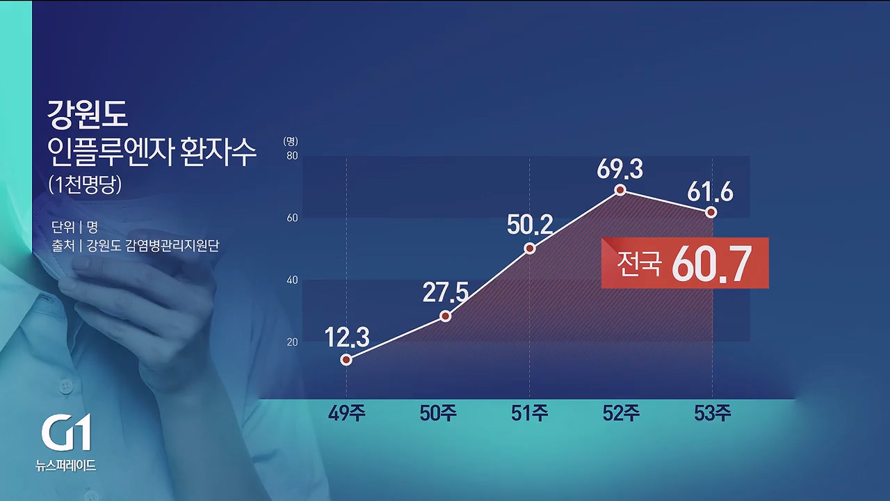 지난해 49주째 천 명당 12.3명 이던 독감 환자 수가, 매주 늘어 마지막 주에는 61.6명까지 치솟았습니다./