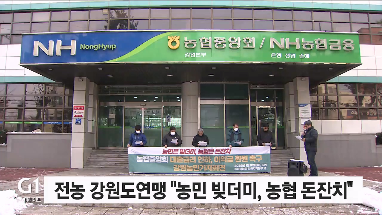 전국농민회총연맹 강원도연맹이 오늘(16일) 농협중앙회의 대출 금리 인하와 이익금 환원을 촉구하는 기자회견을 열었습니다.