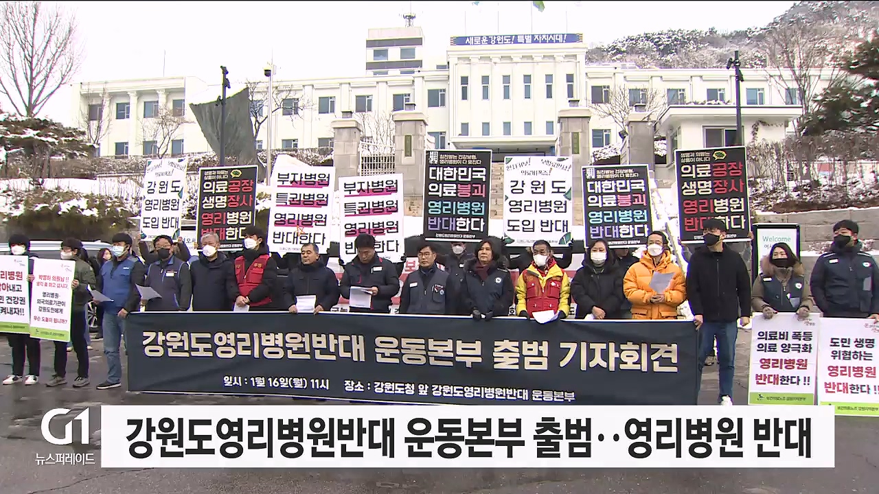 민주노총 강원지역본부와 정의당, 노동당 등의 진보정당은 오늘(16일) 강원도청 앞에서 '강원도영리병원반대 운동본부'의 출범식을 열었습니다.