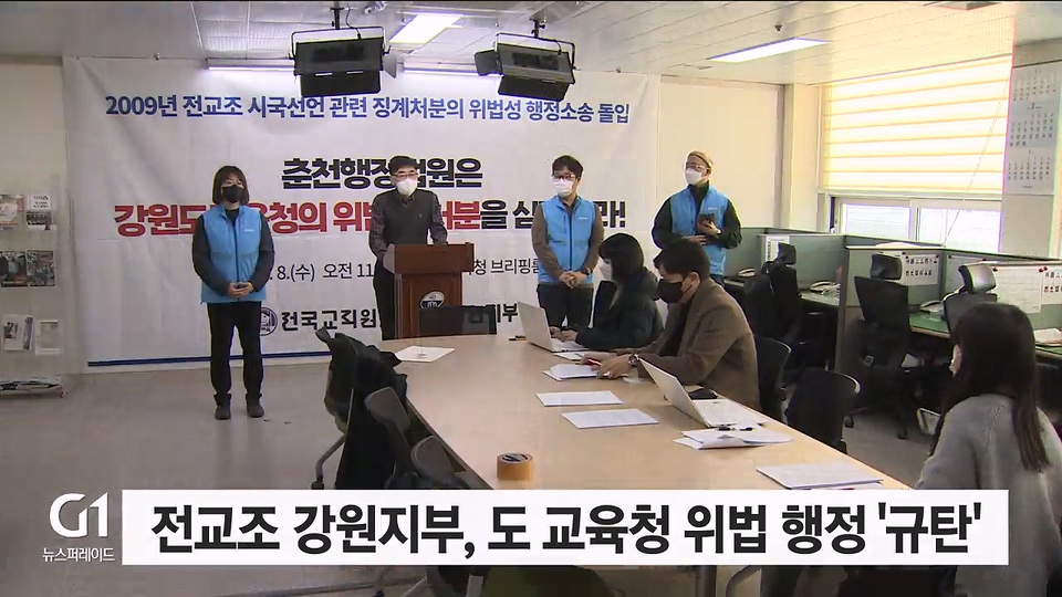 전국교직원노동조합 강원지부가 오늘(8일) 도 교육청 브리핑룸에서 기자회견을 열고 도 교육청의 위법한 행정처분을 규탄했습니다.