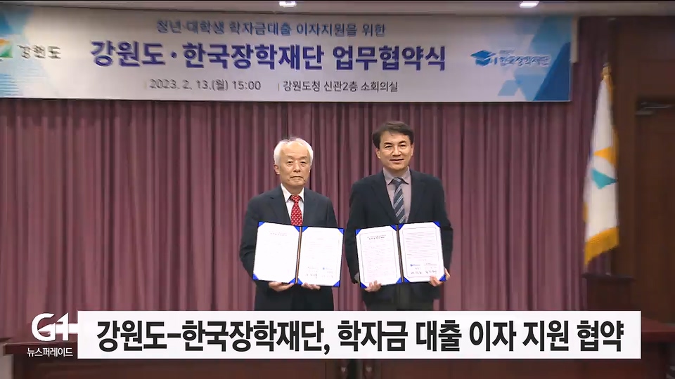 강원도와 한국장학재단이 강원도 청년·대학생 학자금대출 이자 지원을 위한 업무협약을 맺었습니다.