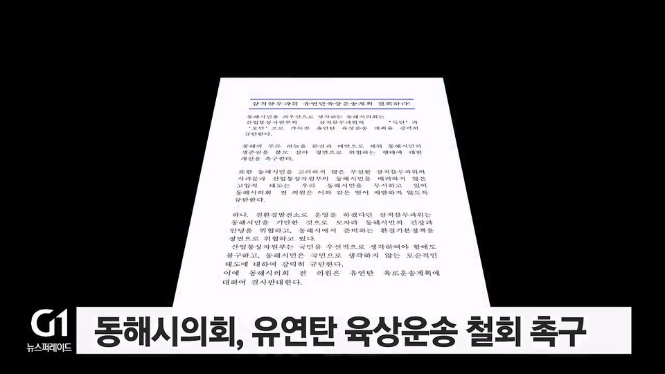 동해시의회는 오늘(14일) 성명서를 내고, "삼척블루파워가 동해시의 환경기본정책을 정면으로 위협하고 있다"며 "유연탄 육상 운송 계획을 강력히 규탄한다"고 밝혔습니다.