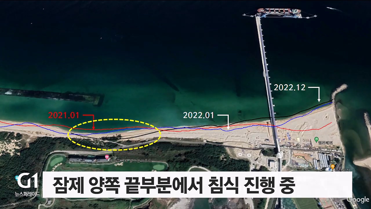 "이같은 해안침식을 막기위해 해상에 '잠제'가 설치돼 있지만, 이처럼 잠제 위치를 기준으로 양 극단에서 또 침식이 발생하고 있습니다."