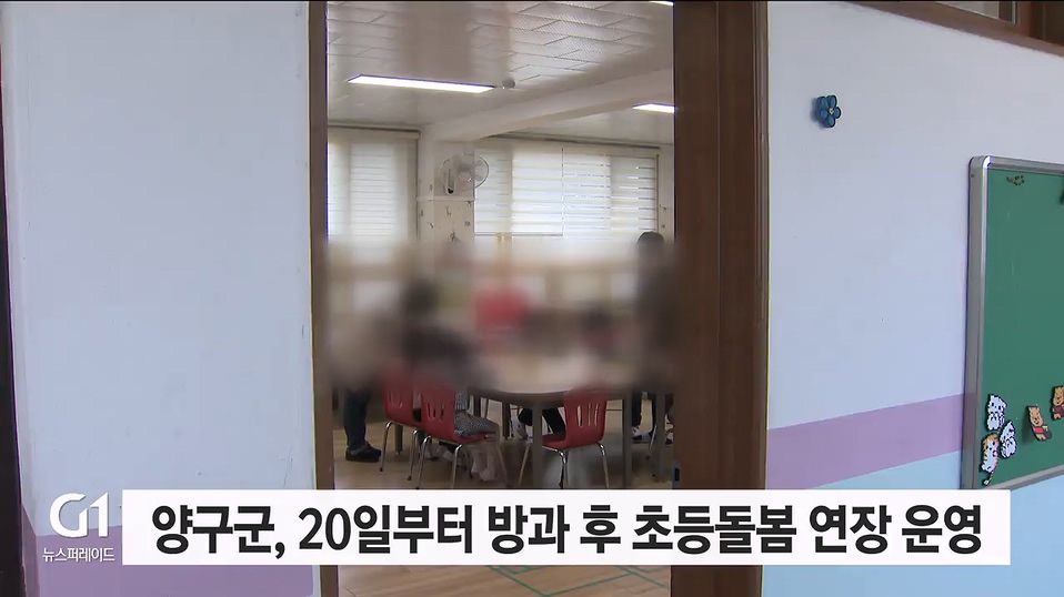 양구군은 맞벌이 등 가정 환경으로 인한 양육 공백 해소를 위해 오는 20일부터 초등돌봄교실을 연장 운영한다고 밝혔습니다.