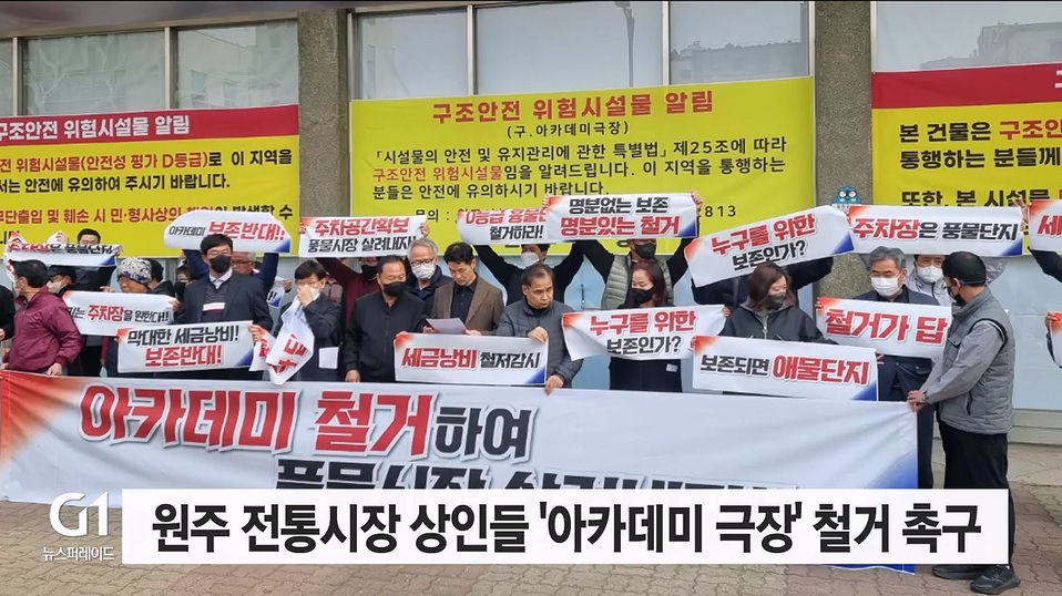 원주 풍물시장상인회와 소상공인연합회 등은 오늘(8일) 아카데미 극장 앞에서 기자회견을 열고, 즉각적인 철거와 함께 활용 방안 모색을 촉구했습니다.