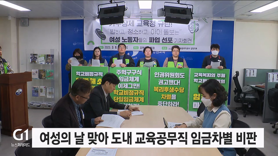 오늘 115주년 세계 여성의 날을 맞아 전국교육공무직 강원본부가 도 교육청에서 기자회견을 열고 여성 노동에 대한 교육청의 임금 차별을 비판했습니다.